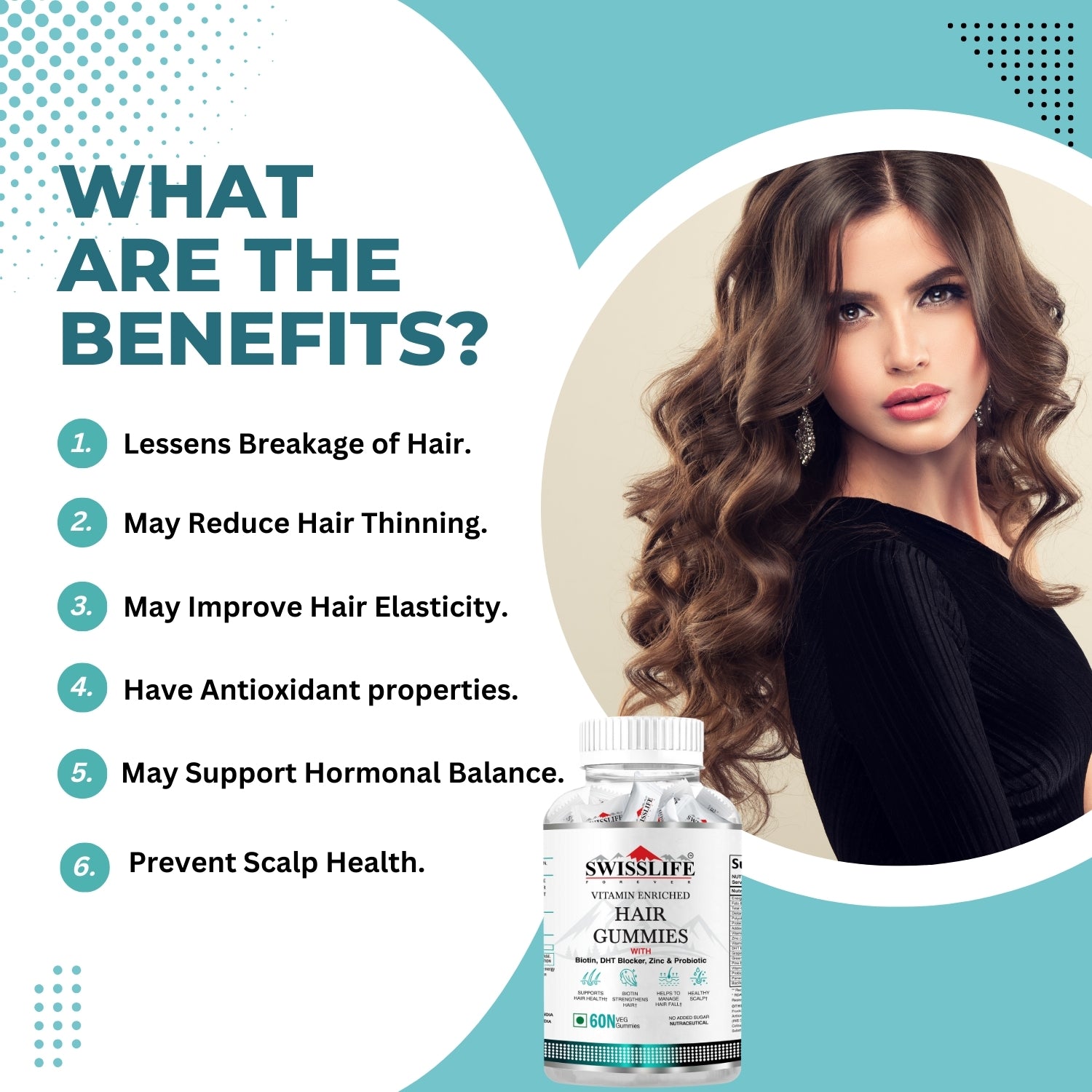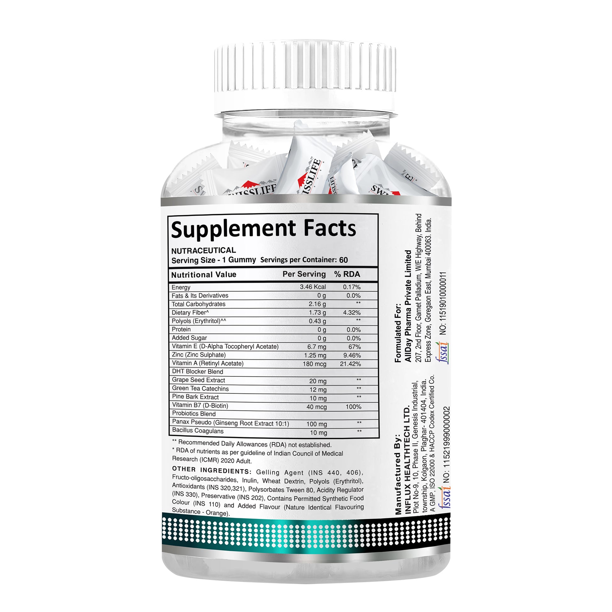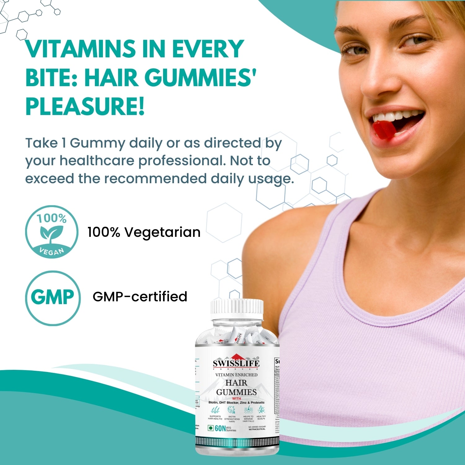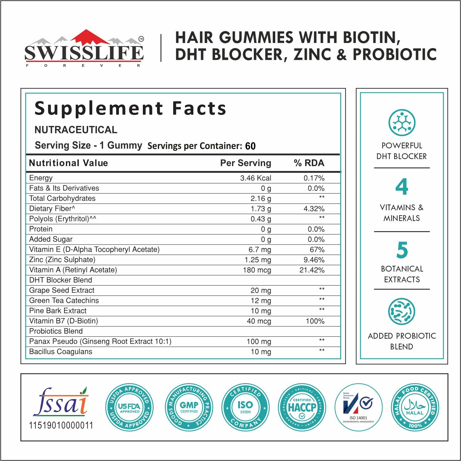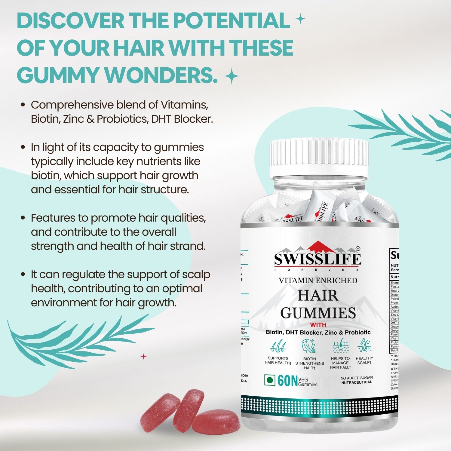 SwissLife Forever Hair Gummies with Biotin, DHT Blocker, Zinc & Probiotics | Supports Hair Growth, Scalp Health & Helps Reduce Hair Fall | For Men & Women | Vitamin-Enriched Gummies | 60 Gummies