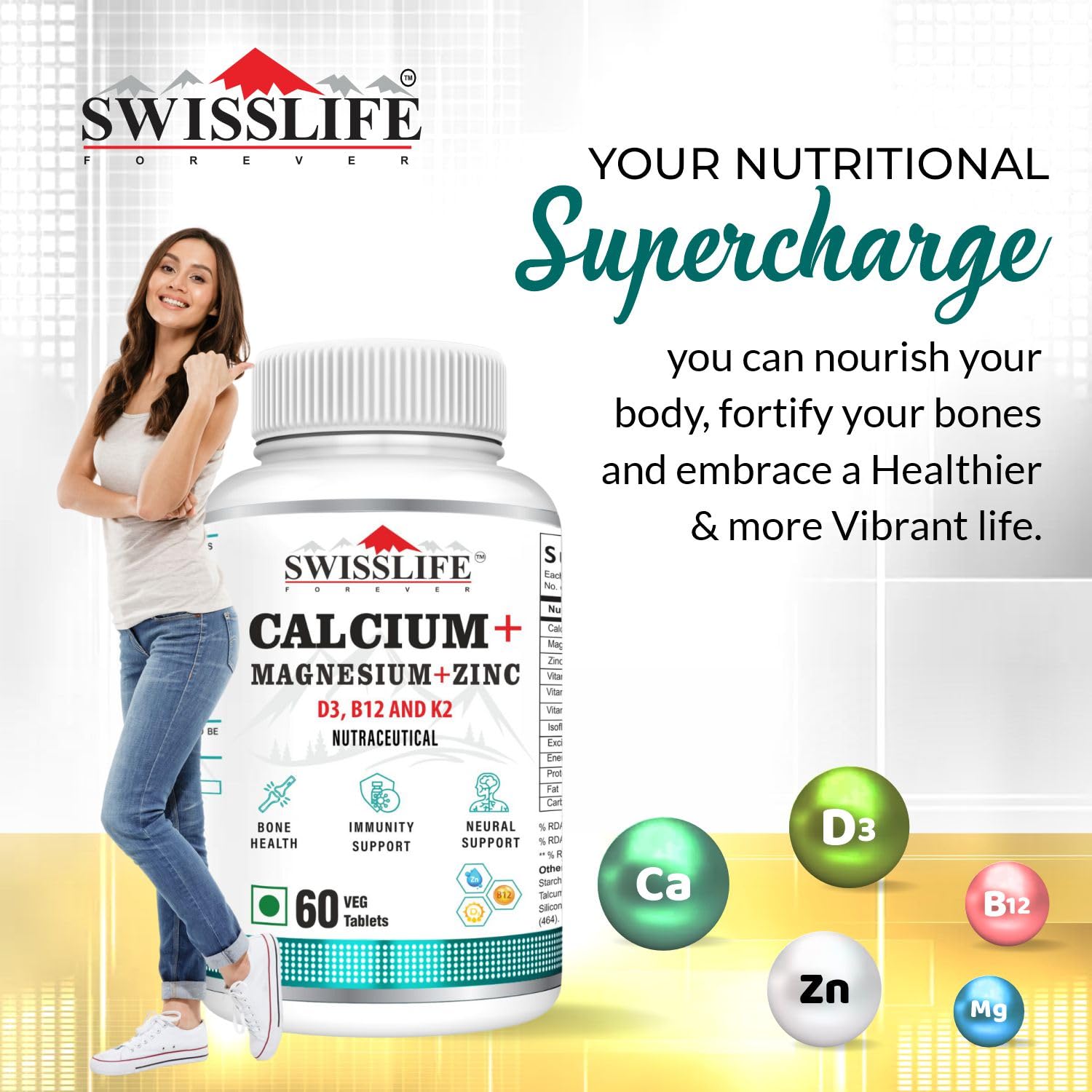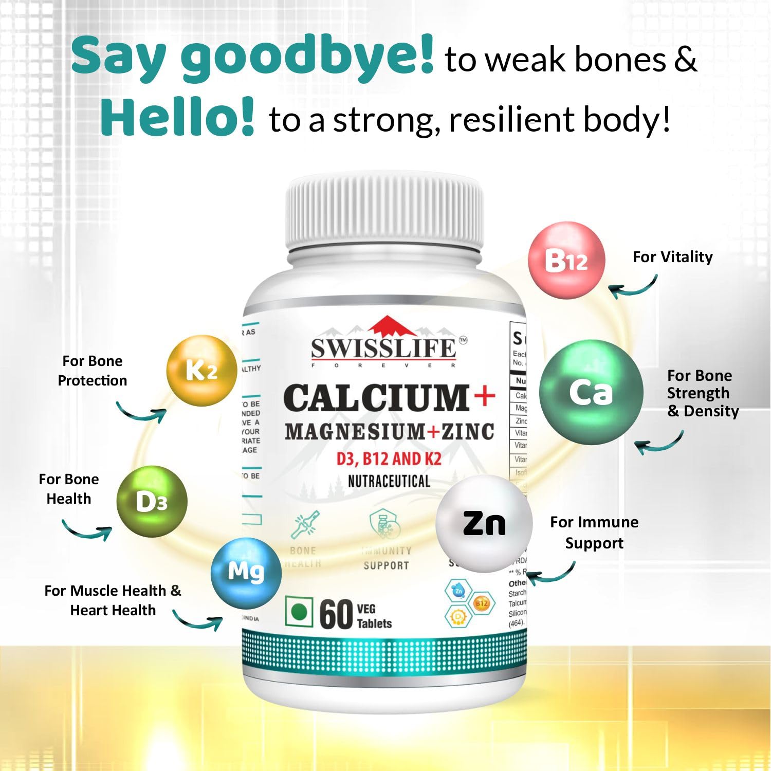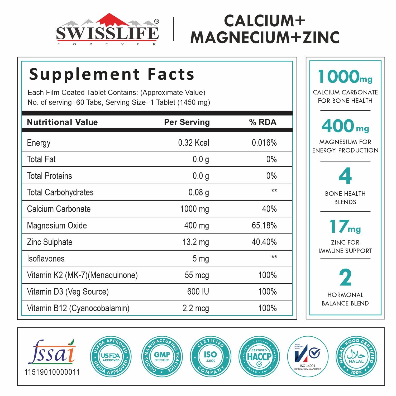 Simplify your supplement routine with SWISSLIFE FOREVER Calcium + Magnesium + Zinc tablets. Our Calcium Veg Tablets combines essential nutrients for bone health, immunity and energy, allowing you to optimize your well-being with just one powerful formula. It Support your bones, muscles, and immune system with our Calcium Magnesium Zinc with Vitamin D3 tablets – expertly formulated for optimal absorption and total wellness. Out calcium supplement is Packed with Calcium and Vitamin D3, this essential combo helps build and maintain strong bones and teeth while reducing the risk of osteoporosis as you age. Zinc and Vitamin D3 work together to boost your immune defense, support wound healing, and regulate inflammatory responses.