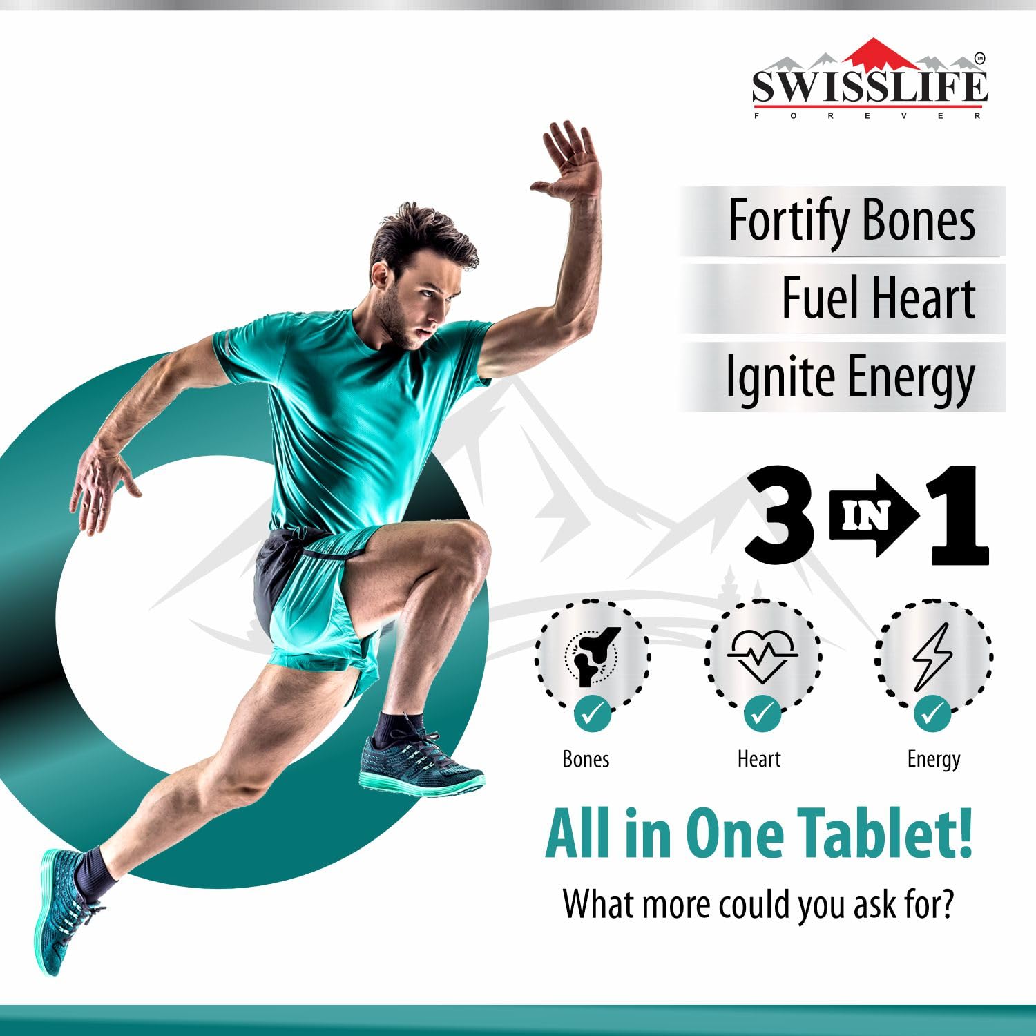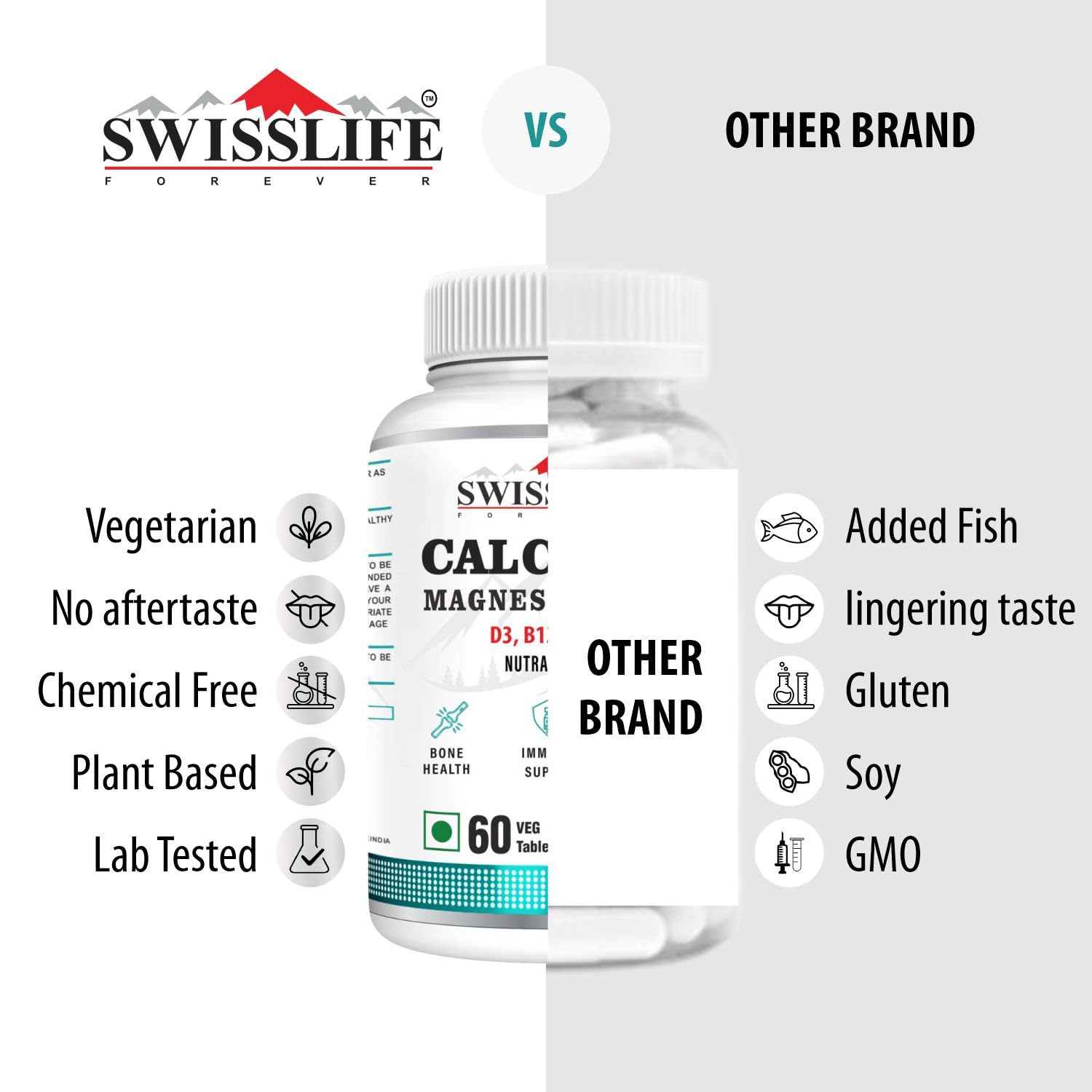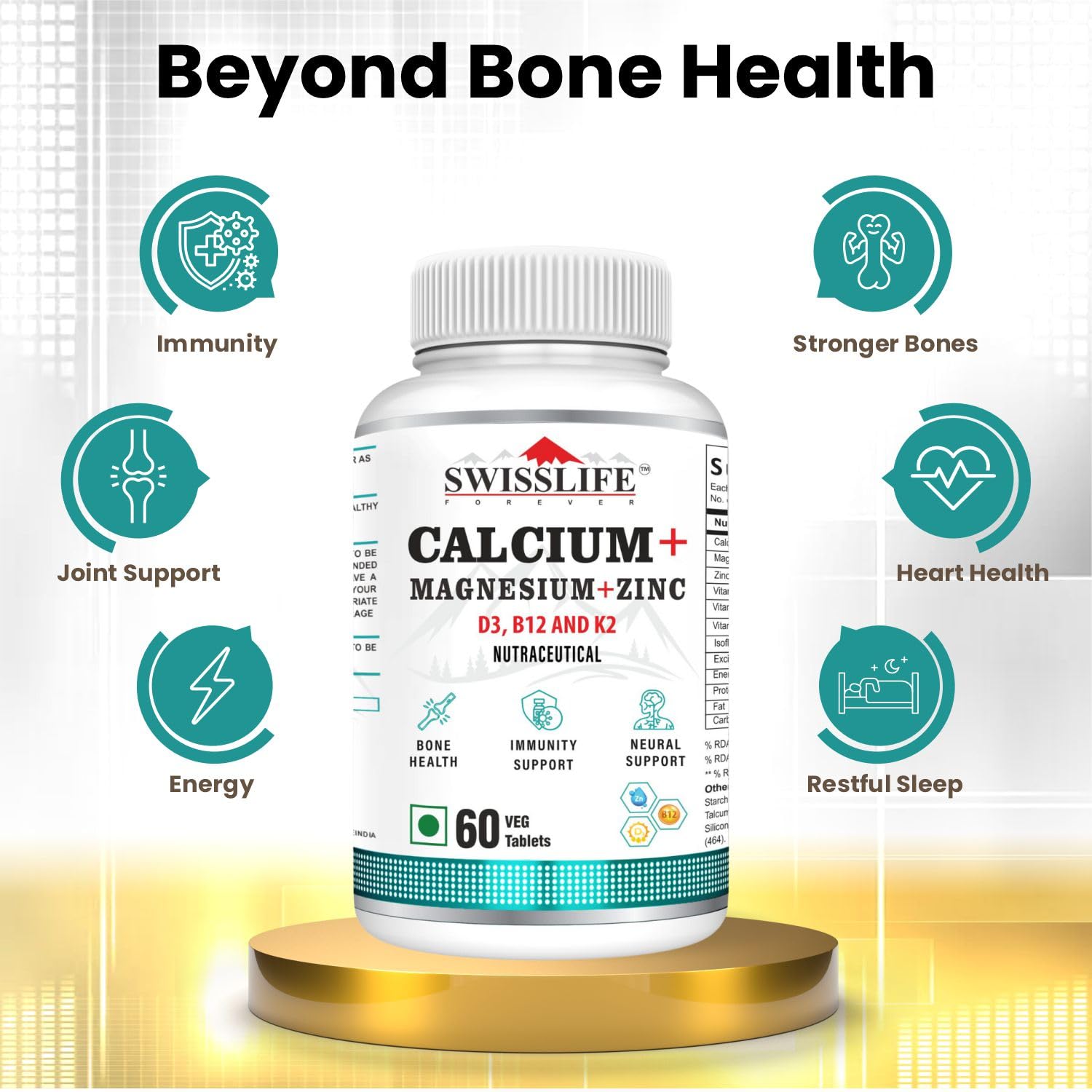 Simplify your supplement routine with SWISSLIFE FOREVER Calcium + Magnesium + Zinc tablets. Our Calcium Veg Tablets combines essential nutrients for bone health, immunity and energy, allowing you to optimize your well-being with just one powerful formula. It Support your bones, muscles, and immune system with our Calcium Magnesium Zinc with Vitamin D3 tablets – expertly formulated for optimal absorption and total wellness. Out calcium supplement is Packed with Calcium and Vitamin D3, this essential combo helps build and maintain strong bones and teeth while reducing the risk of osteoporosis as you age. Zinc and Vitamin D3 work together to boost your immune defense, support wound healing, and regulate inflammatory responses.