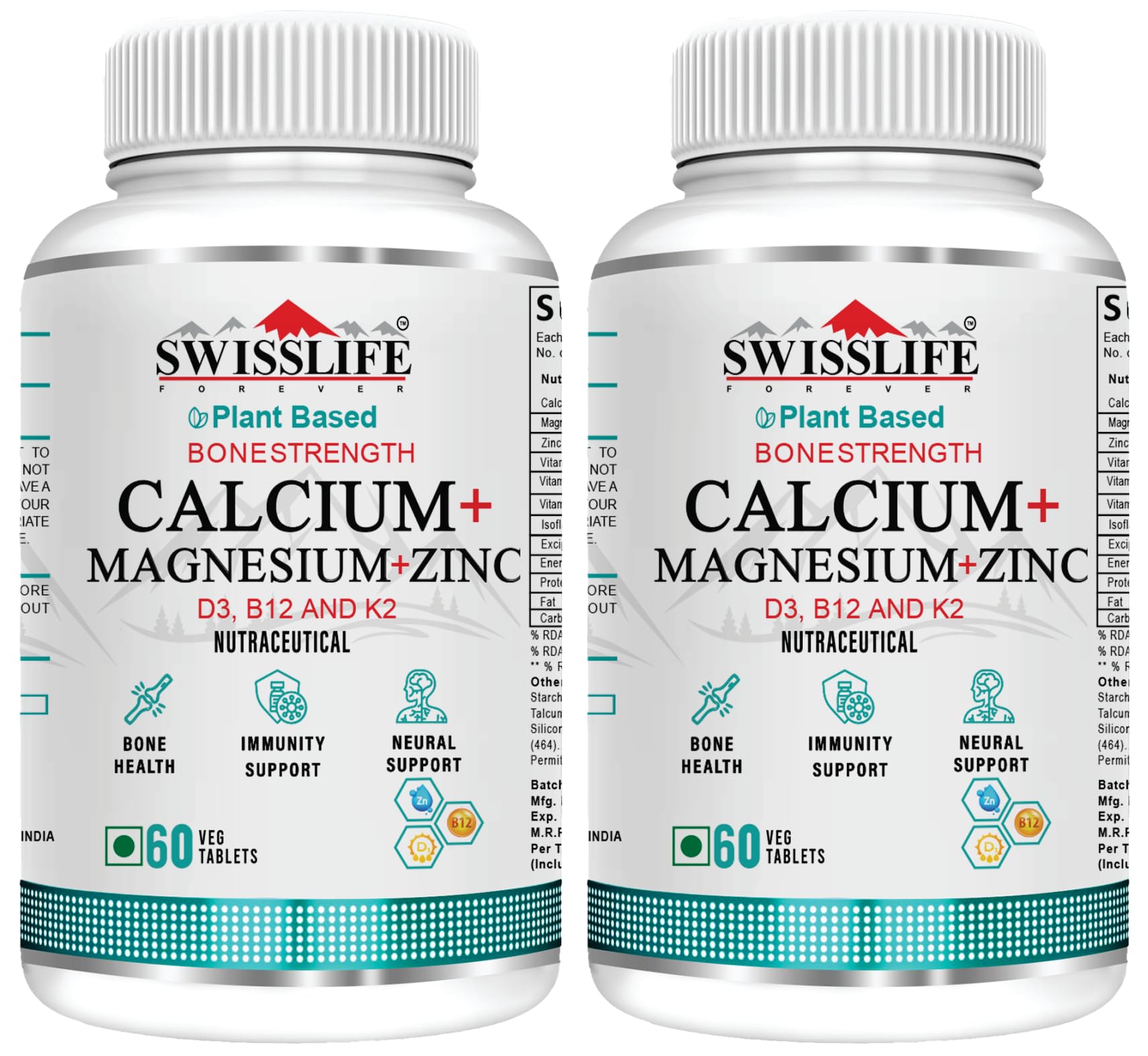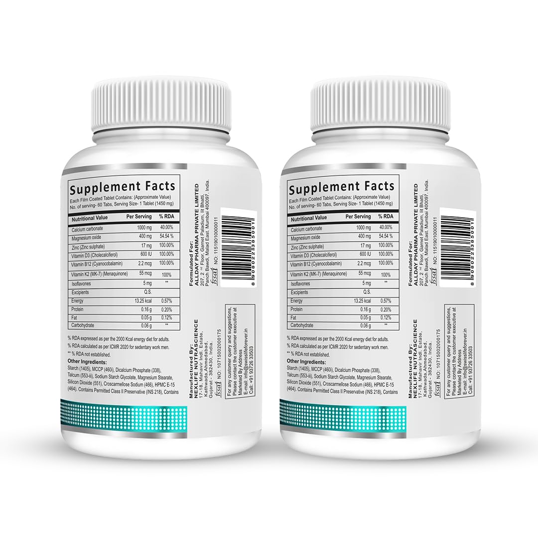 SwissLife Forever Calcium Magnesium Zinc with Vitamin D3, K2 MK7 & B12 | Bone Strength, Immunity & Nerve Health Support | Calcium Supplement for Men & Women | 60 Tablets (Pack of 2)