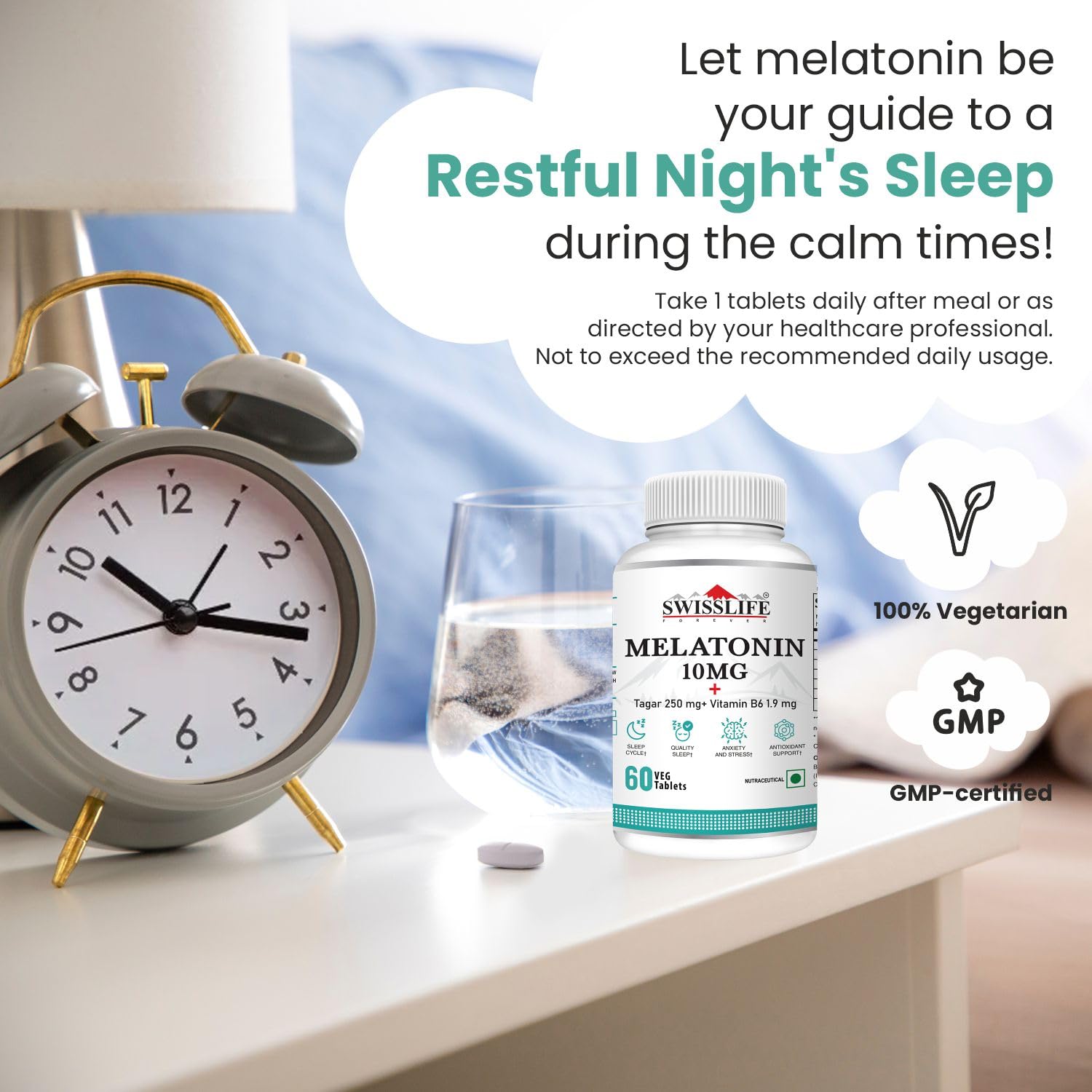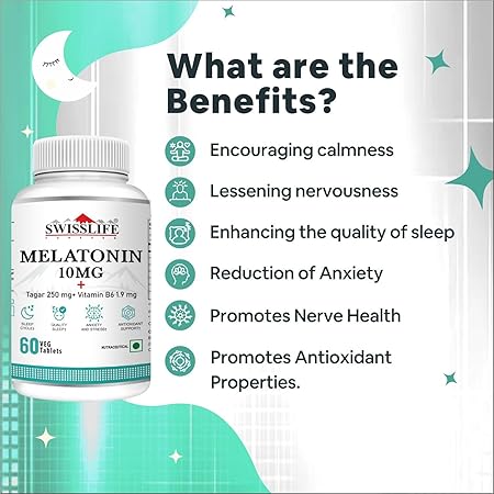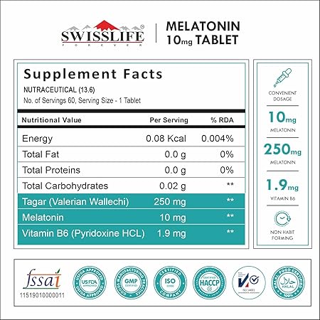 SwissLife Forever Melatonin 10mg+ Tablets with Tagar & Vitamin B6 | Supports Sleep Cycle & Nerve Health | For Men & Women | Non-Habit Forming & Vegan | 60 Tablets