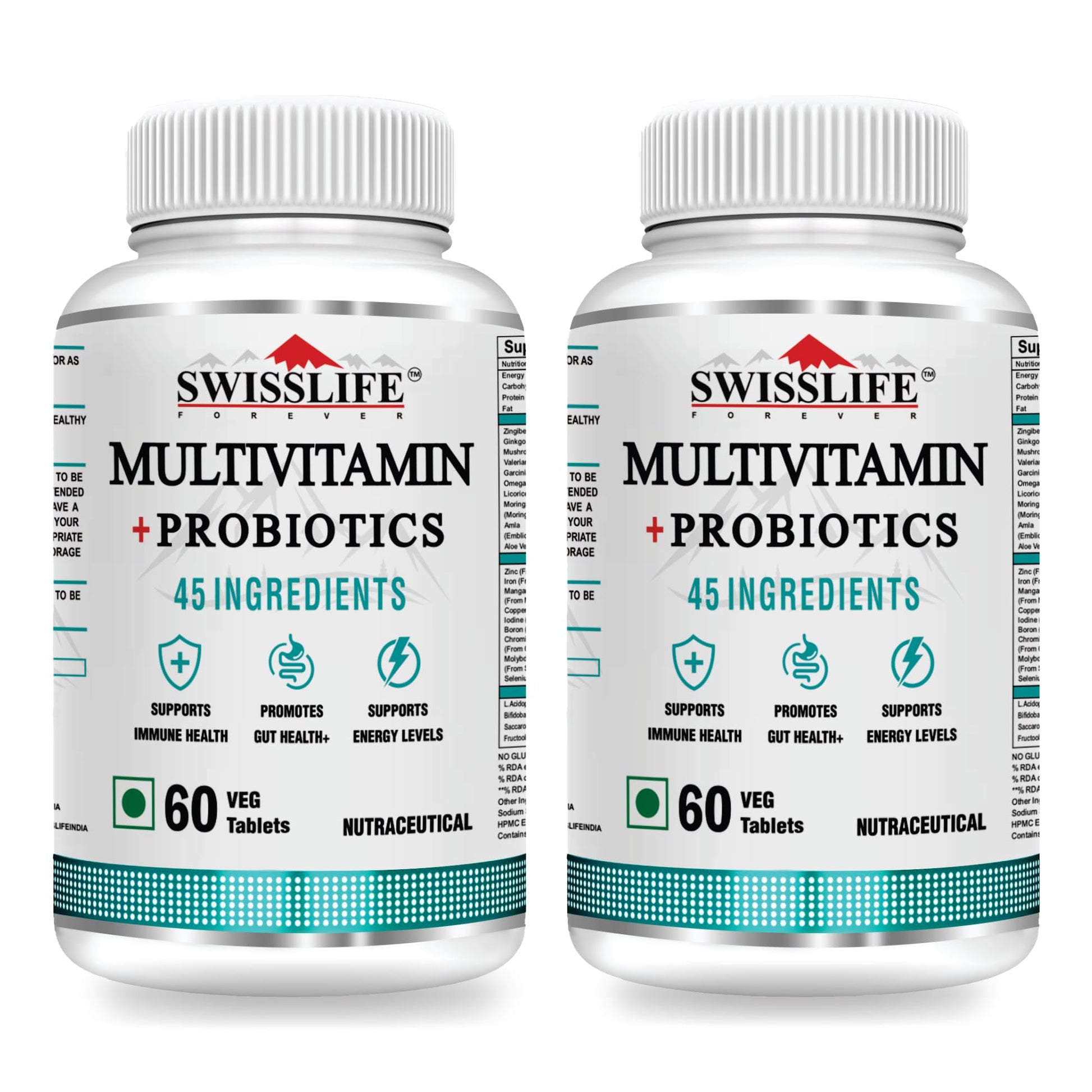 SwissLife Forever Multivitamin with Probiotics | 45 Ingredients with Vitamins A, B Complex, C, D, E, Zinc, Biotin, Minerals & Giloy | For Men & Women | 60 Tablets (Pack of 2)