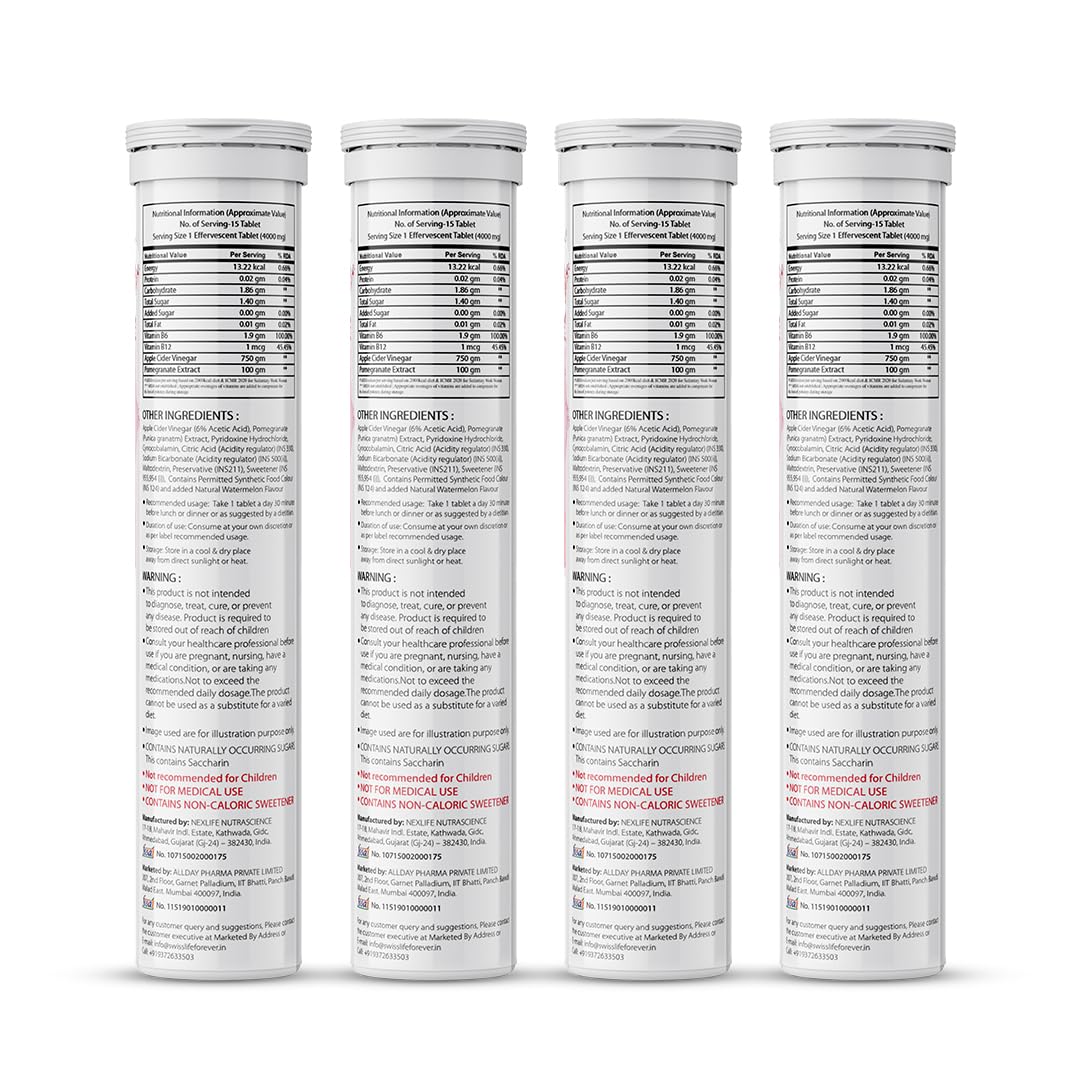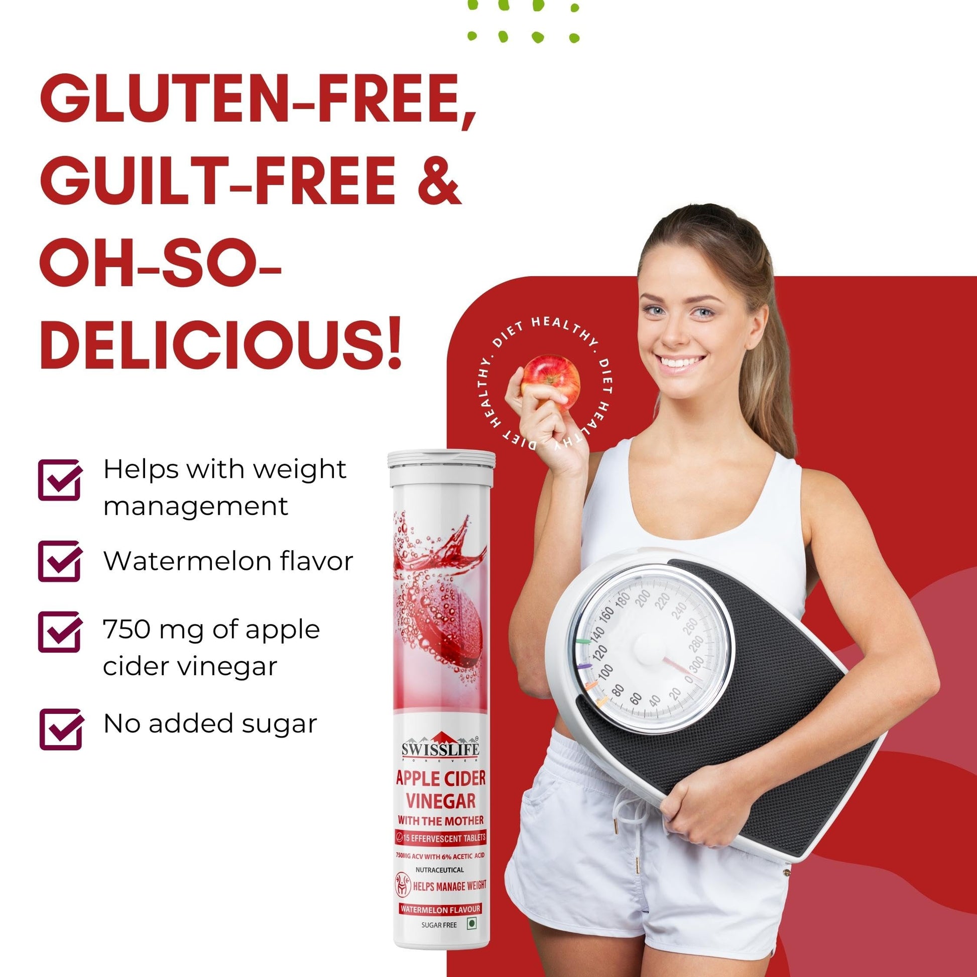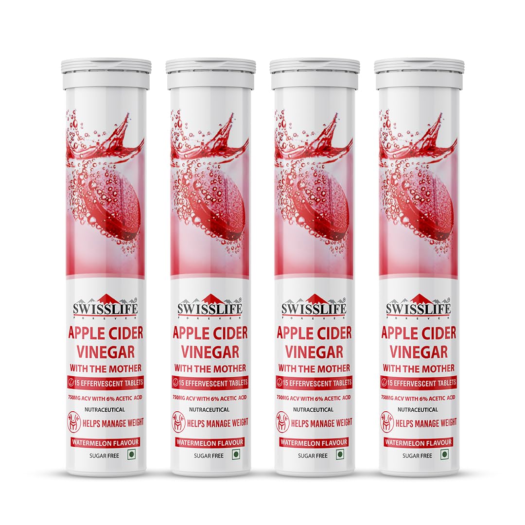 SwissLife Forever Apple Cider Vinegar 750 mg Effervescent Tablets | with Vit.B6, Vit.B12 | Helps with weight management, Supports digestion, No added Sugar | Watermelon flavor (15 Tablets, Pack of 4)