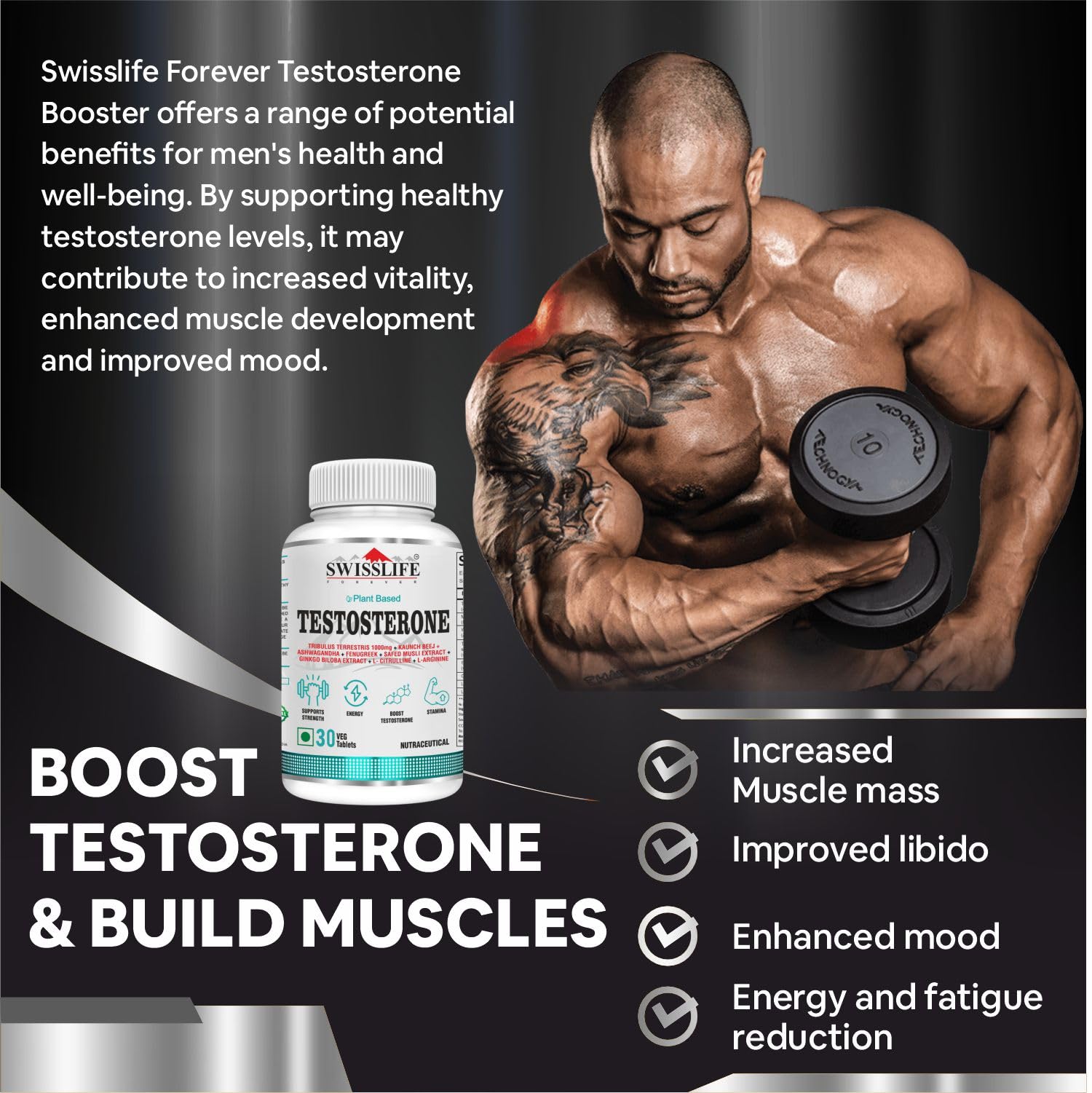 SwissLife Forever Testosterone Booster is formulated with key ingredients such as Tribulus Terrestris, known for its role in supporting healthy testosterone levels. Tribulus Terrestris aids in promoting muscle growth and repair, contributing to a leaner physique and increased strength.