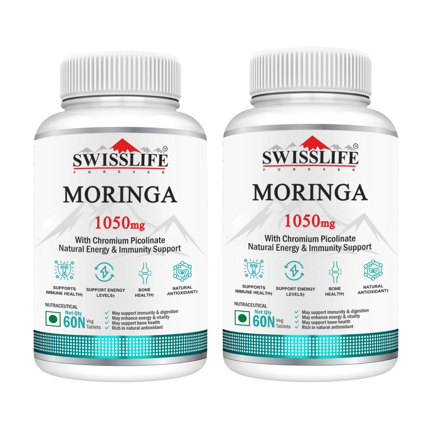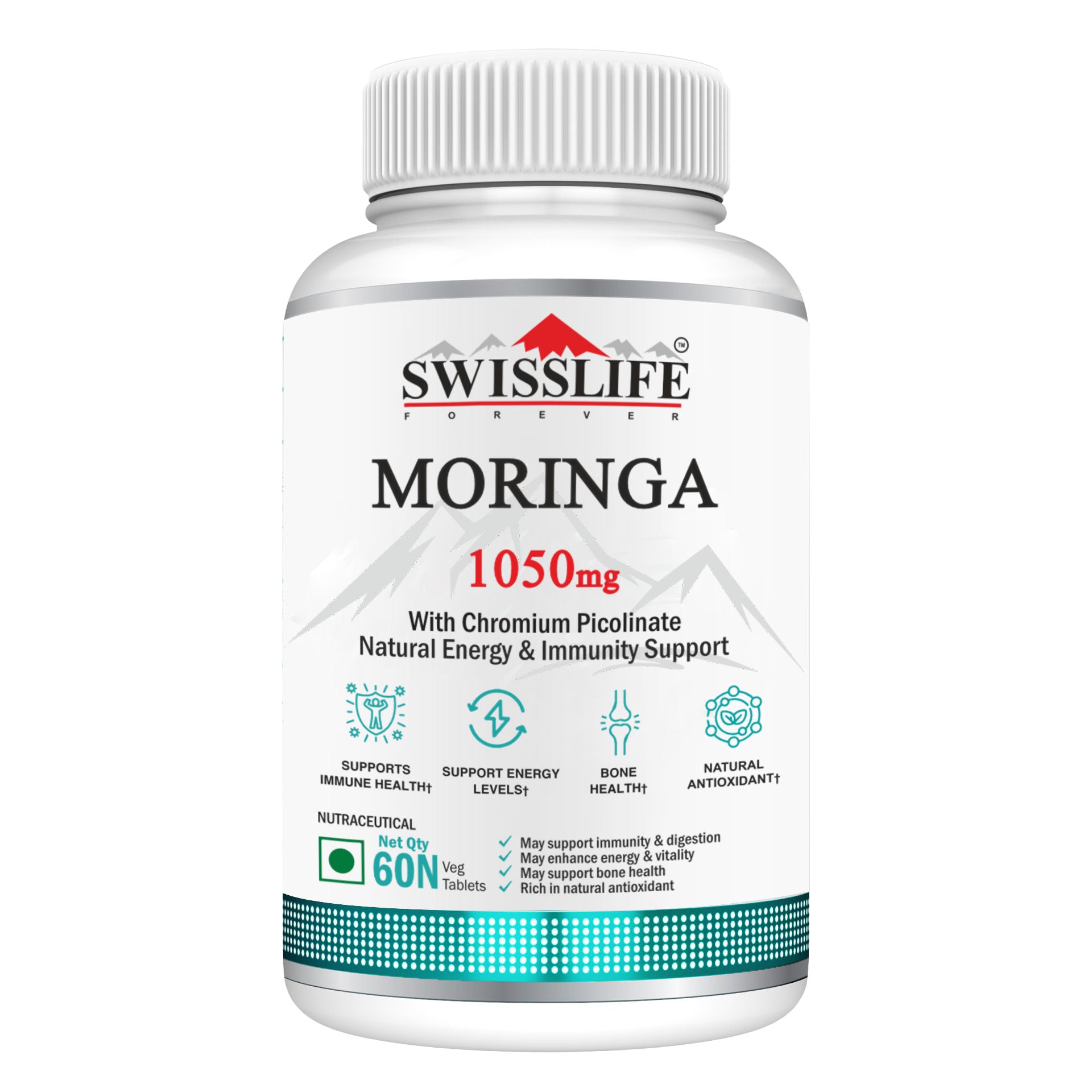 Discover the natural goodness of Swisslife Forever Moringa Tablets enriched with Chromium Picolinate – a powerful blend designed to support your daily wellness goals. Moringa, often called the “Miracle Tree,” is a nutrient-dense superfood packed with plant-based vitamins, minerals, and antioxidants. Combined with Chromium Picolinate, this formulation helps in maintaining overall energy, vitality, and metabolic balance.