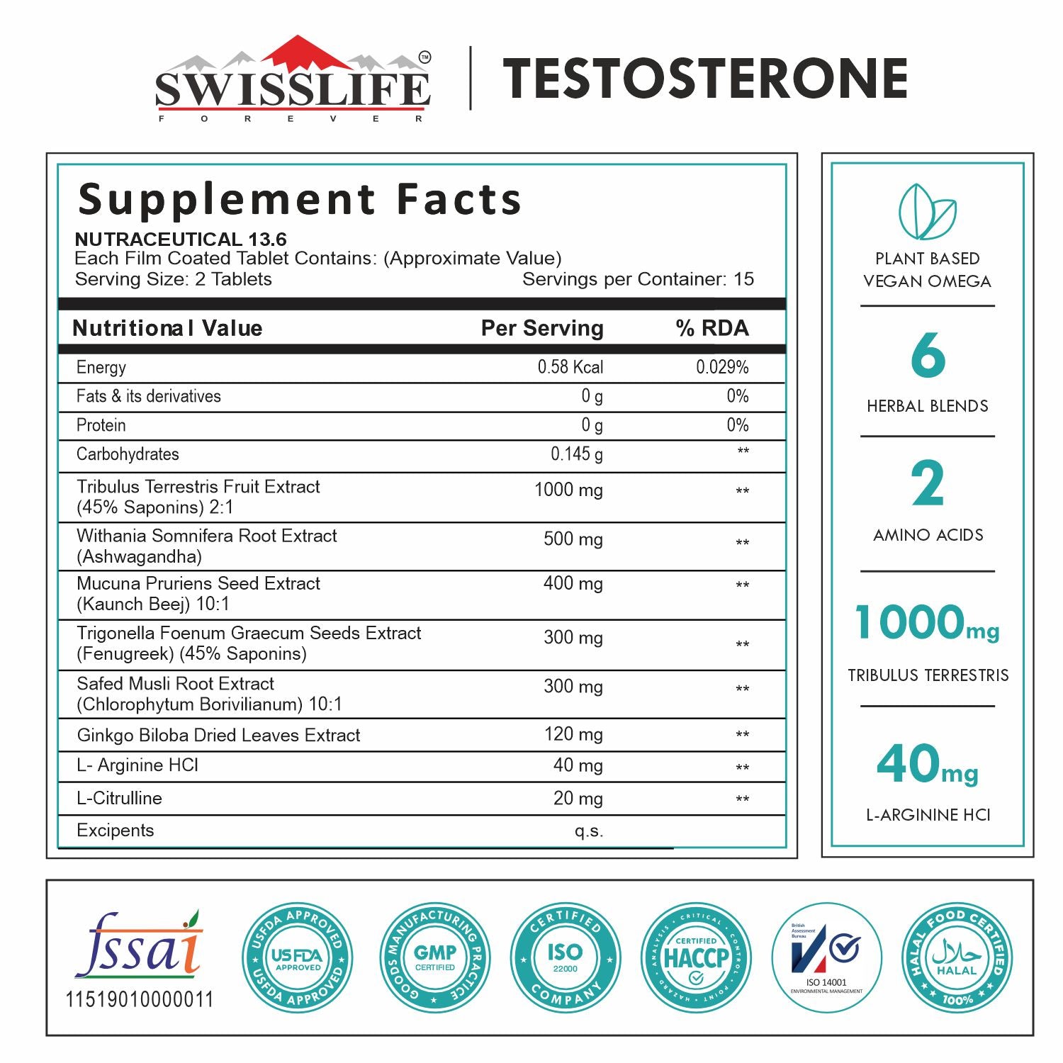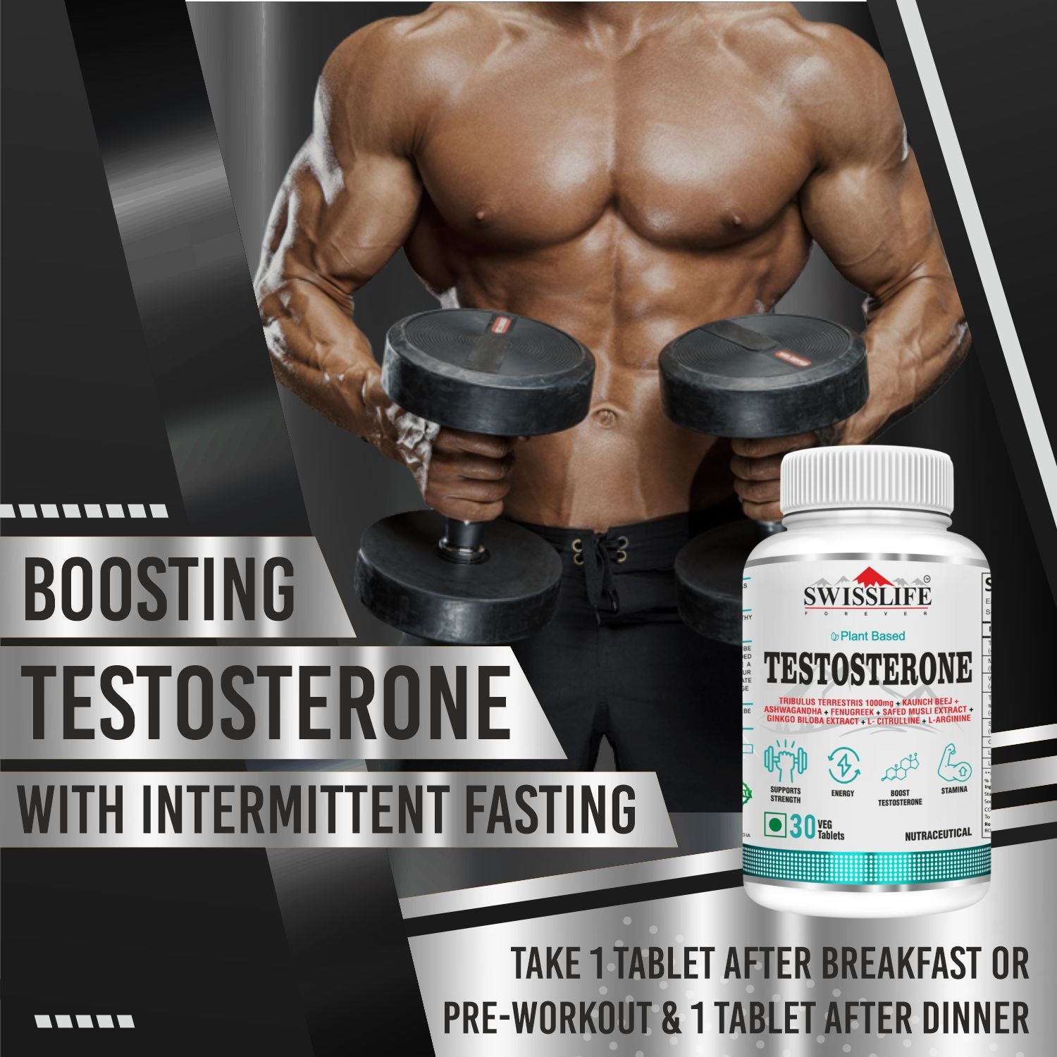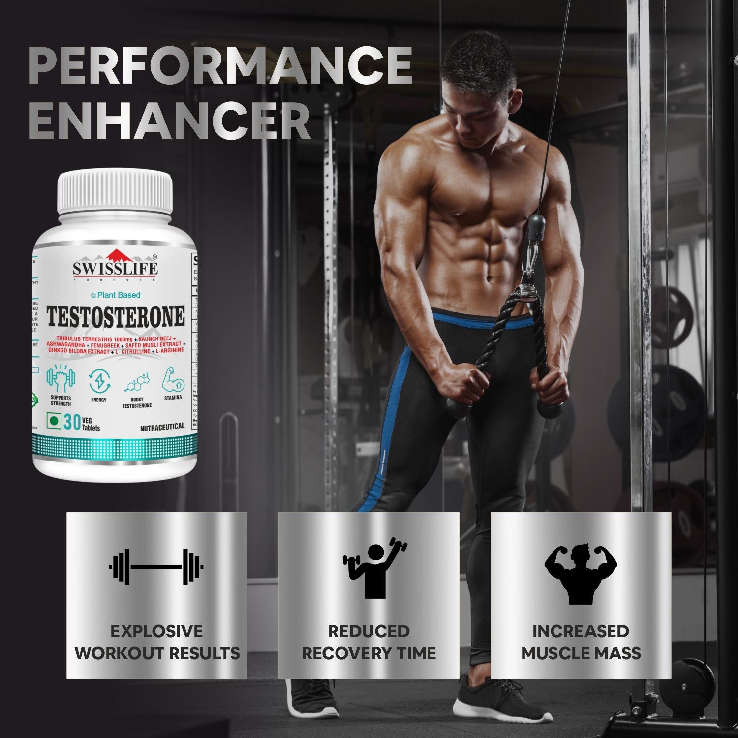 SwissLife Forever Testosterone Booster is formulated with key ingredients such as Tribulus Terrestris, known for its role in supporting healthy testosterone levels. Tribulus Terrestris aids in promoting muscle growth and repair, contributing to a leaner physique and increased strength.